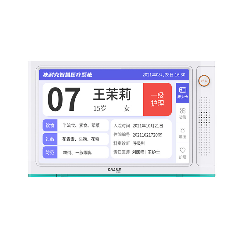 安裝在病床頭的交互設(shè)備機(jī),代替?zhèn)鹘y(tǒng)紙質(zhì)卡。產(chǎn)品支持呼叫對講、為住院患者提供病例查詢、狀態(tài)自動提醒等護(hù)理需求等。