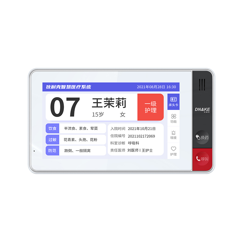安裝在病床頭的交互設(shè)備機(jī),代替?zhèn)鹘y(tǒng)紙質(zhì)卡。產(chǎn)品支持呼叫對講、為住院患者提供病例查詢、狀態(tài)自動(dòng)提醒等護(hù)理需求等。